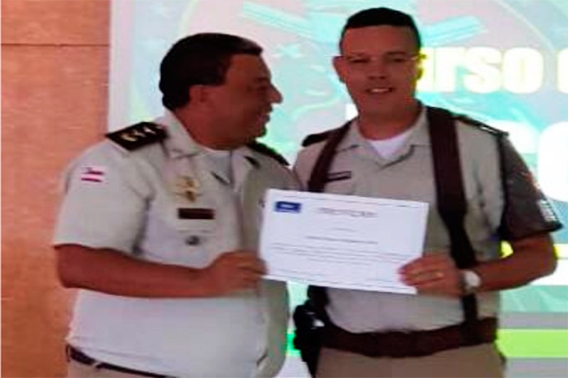 Capitão Valmari Júnior (direita) recebendo o certificado de conclusão do Curso de Excelência da PM Bahia (Foto: Divulgação 34ª CIPM)