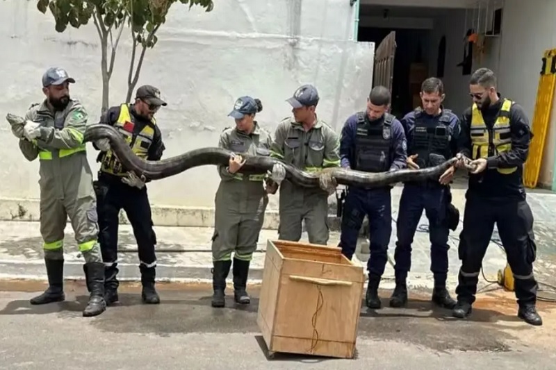 Uma sucuri de aproximadamente 4,8 metros de comprimento foi capturada na manhã do sábado (8) próximo a uma rede de esgoto, em Euclides da Cunha, no norte da Bahia. O resgate do animal foi realizado pela equipe do Anjos do Cumbe, grupo de bombeiros civis voluntários, com o apoio de agentes de trânsito, Guarda Municipal e o especialista em preservação de serpentes conhecido como Zé da Cobra. Foram necessárias sete pessoas para segurar a cobra, que foi retirada com segurança do local. Após a captura, a sucuri foi levada para a base da equipe e, posteriormente, será entregue ao Instituto do Meio Ambiente e Recursos Hídricos (Inema). O órgão ficará responsável por direcionar o animal de volta ao seu habitat natural. O caso chamou a atenção pela dimensão da cobra e, segundo o Anjos da Cumbe, um trabalho de monitoramento que durou quase um ano, em que a equipe acompanhou o deslocamento do animal para identificar um local seguro para a captura, garantindo a segurança da cobra e dos profissionais envolvidos.