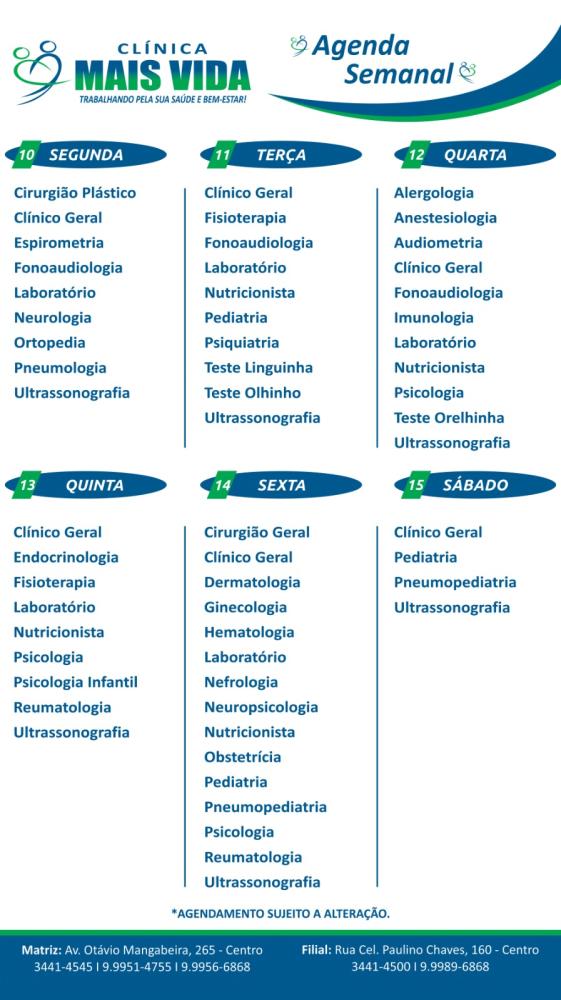 Com o objetivo de facilitar a marcação de consultas, a Clínica Mais Vida criou um quadro com os dados de atendimento dos especialistas e procedimentos. A clínica funciona de segunda a sábado. Confira o quadro acima e marque a sua consulta através dos telefones (77) 3441-4545 / (77) 99951-4755 / (77) 99180-9496 / (77) 3441-4500 / (77) 99989-6868 (77) 99956 -6868. A nossa matriz está localizada na Avenida Otávio Mangabeira, 265 (Próximo a Biblioteca) e nossa filial na Rua Coronel Paulino Chaves, 160, Centro.