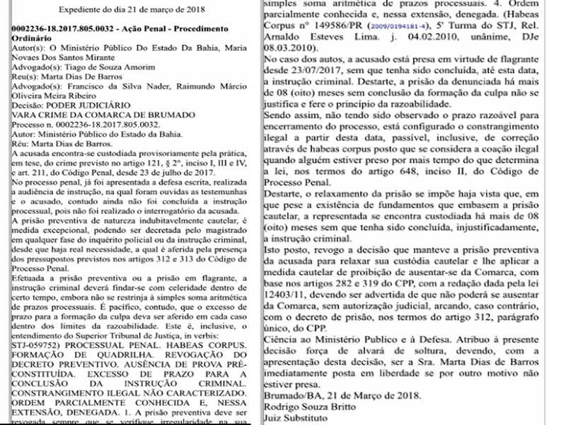 O “Caso Regimalço” ainda não foi totalmente desvendado pela Polícia. O fato que ocorreu na Comunidade de Paris de Matias, município de Aracatu, no dia 22 de julho de 2017, ganhou uma grande repercussão, já que além da morte cruel da vítima por apedrejamento, o possível executor foi encontrado morte envenenado na zona rural de Barra da Estiva. A principal suspeita pelo homicídio qualificado foi a própria esposa do lavrador, Marta Dias de Barros (33), foi presa, já que os indícios dela ter sido a mandante do crime eram muito fortes, segundo a Polícia. Custodiada há 8 meses pelo artigo 121 do CPP, a acusada teve a revogação da sua prisão preventiva por meio de uma decisão judicial da Vara Crime da Comarca de Brumado. Segundo as alegações, não foi concluído o processo de instrução, então, diante disso, de acordo com os artigos 312 e 313 do CPP, não se justifica mais a custódia da acusada, já que isso iria de encontro ao princípio da razoabilidade, se criando assim um constrangimento ilegal, pois uma pessoa não pode ficar mais tempo presa além do que a lei determina. A acusada, porém, vai ter que se apresentar regularmente à Comarca até que seja concluído o processo de instrução, que vai decidir se ela irá a júri popular ou não. A soltura acabou causando revolta na família do lavrador, que acredita ter sido ela a mandante da morte. Confira abaixo a decisão da Justiça: