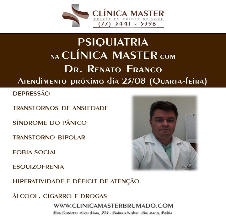 Hoje em dia todas as doenças psiquiátricas têm tratamento para o seu alívio e muitas vezes controle completo. Sendo feito com boa orientação médica e com as medicações disponíveis atualmente, este tratamento pode ser feito sem risco de dependência. Somente na CLÍNICA MASTER você encontra o renomado psiquiatra Dr. Renato Franco, que estará atendendo na próxima quarta-feira dia 23/08. A CLÍNICA MASTER fica situada na rua Donizete Alves Lima, 225, Bairro Nobre (em frente à Dimak Malhas). Agende já a sua avaliação (77) 3441 5396, (77) 9 9991 5396 e (77) 9 9126 1903. CLÍNICA MASTER, PRAZER EM CUIDAR DE VOCÊ!