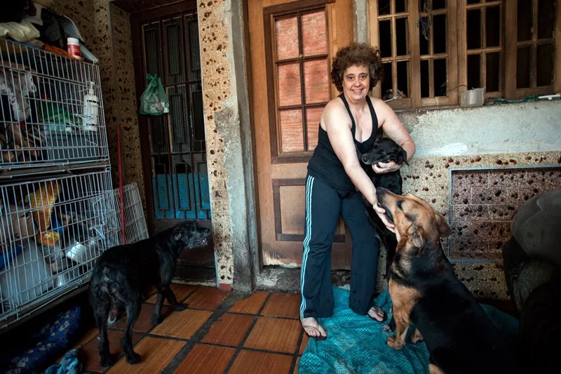 Uma protetora animal que já acolheu 84 cães em sua casa, em Moema, na Zona Sul de São Paulo, provoca polêmica com os vizinhos, que se dizem incomodados com o barulho e com o mau cheiro. O Ministério Público acompanha o caso. Rosângela de Abreu recebeu a reportagem do G1 para contar sua versão da história. “Sou filha única. Quando nasci, acho que minha mãe já percebeu, ‘Ih, essa daí já vai dar problema suficiente”, brincou. “Venho de uma família que sempre adorou animal. Eu tinha um gatinho, que ficava no berço comigo e o cachorro da minha mãe ficava ao lado, vigiando”, contou, enquanto os cachorros de diferentes tamanhos abanavam o rabo e pulavam em cima dela.  Ela apresentou o imóvel, que estava sujo e com cheiro forte. “Os problemas começaram justamente quando eu pretendia reformar a casa”, contou Rosângela, que está com 49 anos e mora com a família na casa adquirida há 75 anos no bairro, quando a “Avenida Iraí era um rio e o Shopping Ibirapuera era um campo de futebol”. O afeto pelos animais cresceu na adolescência, conforme ela se aproximou de pessoas ligadas à proteção animal, e, anos mais tarde, fundou a ONG Auqimia em Parelheiros, na Zona Sul da cidade. “Aluguei um sítio, onde ficamos por cerca de 13 anos, até que o proprietário pediu o local. A esta altura, eu estava com mais de 100 cães, mas tive que arrumar um outro espaço com urgência” disse. Era 2015. Rosângela conseguiu outro terreno, mas teve um novo problema. Um homem teria reivindicado o espaço como seu e conseguiu a reintegração de posse da nova área junto a Prefeitura Regional. Ela deixou dezenas de cães na área e se viu obrigada a trazer outros 84 para dentro de sua casa com o objetivo de doar os bichos aos poucos. Após doações, ela reúne 37 cães no imóvel. A situação se tornou de conhecimento geral no bairro, a vizinhança passou a acreditar que Rosângela tem distúrbios de acumulação, denúncias chegaram ao Ministério Público (MP) e dezenas de animais foram removidos do local.