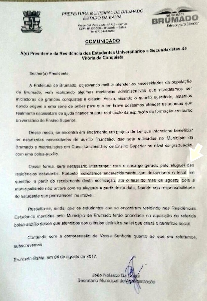 A sessão da Câmara de Vereadores de Brumado desta segunda-feira (14) foi mais intensa e foi marcada por pronunciamentos contundentes e também pela presença de professores municipais e estudantes residentes na REUSB de Vitória da Conquista, que, unidos, fizeram um forte protesto contra o Projeto de Lei 012/2017 e também sobre o comunicado velado de despejo que foi passado aos estudantes. Neste interstício, o vereador Lek Cabeleireiro (PV), aproveitando o momento efusivo, fez um forte desabafo em sincronia aos pedidos dos professores, bem como do pleito dos alunos, sendo totalmente contrário ao fechamento da Casa do Estudante na cidade de Vitória da Conquista e votando contrário ao Projeto 021/2017. Segundo o parlamentar, o projeto de remanejamento de recursos, não é claro, possui contradições e ainda pode estar eivado de vícios, de modo que, por questão de precaução jurídica e bom sendo o vereador declarou que "eu entendendo que o recurso em sua totalidade deva ser direcionado à área de educação, daí o meu motivo por que me posicionei contrariamente". Em seguida Lek se solidarizou com os estudantes e denominou como vergonhosa a situação do nosso município no que tange ao tratamento dado aos estudantes. Muito seguro ele afirmou que "a Casa do Estudante é fundamental para os alunos de baixa renda e que precisam desse apoio, então, eu na posição de defensor do povo, sou contrário a essa ação de fechamento. Iremos continuar nessa luta no intuito de proteger e evitar que os alunos sejam despejados de maneira covarde". A sessão da câmara se alongou e o vereador teve oportunidade ainda de pedir em caráter de urgência a reforma do regimento interno da Casa Legislativa, criticando duramente a forma de votação, bem como outros pontos que se apresentam de maneira subjetiva. Confira abaixo trecho da fala do vereador na sessão do dia 14 de agosto de 2017: