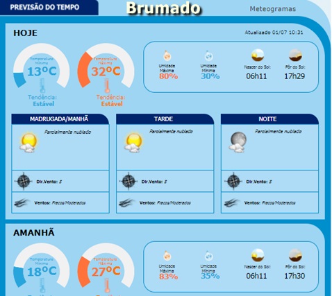 Para os brumadenses apaixonados pelo frio e pelo clima romântico que ele proporciona, esse final de semana oferecerá uma grande oportunidade, já que a previsão é de frio e muita nebulosidade, o que provoca aquela vontade de ficar "agarradinho" com o seu par amoroso. Segundo o INMET – Instituto Nacional de Meteorologia, os termômetros, neste sábado, 1º de julho, devem chegar à casa dos 13 graus, o que é bem difícil por aqui, já que na maior parte do ano a temperatura média fica na casa dos 28 graus. Caso o sol venha a sair das nuvens, a previsão já aponta para temperaturas na casa dos 32 graus de máxima. Para o domingo o frio já não deverá ser tão intenso, pois a mínima apontada é de 18 graus e a mínima de 27. Então, está aí a chance para uma “noche caliente de amor”, que deverá, inclusive, provocar a lotação dos motéis locais. Confira a previsão abaixo: