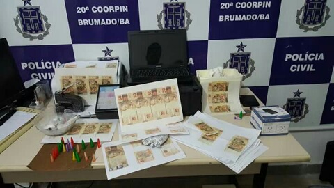 Foto: Polícia Civil Investigadores da Polícia Civil de Brumado prenderam em flagrante delito, um homem de 27 anos, no interior de sua residência, no centro de Brumado. Com ele foram encontrados vários "pinos" de cocaína e várias cédulas falsas de dinheiro, além de um Notebook, impressora e outros artefatos utilizados na falsificação. A Polícia Civil suspeita de que o homem teria criado um perfil "fake" nas redes sociais onde vendia as cédulas falsas em um "Grupo". O suspeito foi autuado em flagrante pela prática dos crimes de tráfico de drogas e moeda falsa, sendo que o inquérito policial deve ser concluído e encaminhado à Justiça no prazo de dez dias.