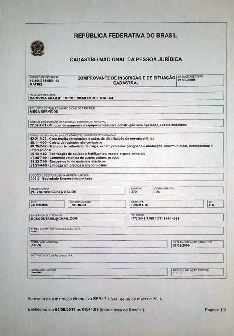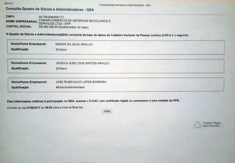 O que chama a atenção e que levanta suspeitas de favorecimento é que a empresa vencedora, Barbosa Araújo Empreendimentos, possa ter ligação direta com a empresa Comar, que é detentora de um contrato com a administração municipal para a realização da limpeza pública da cidade. No mês de abril a referida empresa recebeu dos cofres públicos R$ 251 mil pela realização dos serviços de coleta do lixo, o que projeta para um contrato anual na casa dos R$ 3 milhões. Os indícios são fortes, que vão desde a similaridade no sobrenome dos proprietários, até o endereço que é praticamente o mesmo, a Praça Wagner Costa Ataíde, que fica no Bairro Esconso, sendo o número da Barbosa Araújo Empreendimentos 270-A e o da Comar 270. Segundo informações colhidas pelo 97NEWS cerca de 50 funcionários já foram contratados para a realização dos serviços de limpeza das escolas e creches municipais. Neste contexto uma forte especulação que circula pelos corredores do poder aponta para outra questão séria que seria o fatiamento dos cargos entre os vereadores da base de situação, o que, caso realmente tenha fundamento, pode indicar favorecimento político com a terceirização dos referidos serviços. Segundo novas informações colhidas pela nossa equipe será dada entrada nos próximos dias no Ministério Público uma representação para apurar se os indícios de favorecimento e ganho político são procedentes. Confira abaixo as documentações das referidas empresas citadas: