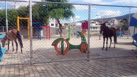 A crise que se instalou no sistema educacional em Brumado devido à resistência dos pais de alunos ao sistema de ensino em tempo integral e que também traz em seu bojo várias solicitações da melhoria da logística de várias escolas da rede municipal, teve um episódio diferenciado na manhã desta quinta-feira (18), o qual, tem um conteúdo animal e vem comprovar que o caso dos animais errantes na cidade, que vem sendo tratado, pelo menos até o momento, com extremo desdém pelo poder público, chegou a um ponto insustentável. O caso em questão tem como “set” a Praça da Ciência em Brumado, a qual foi conquistada para ser um complemento adicional ao aprendizado dos alunos, mas, pelo menos no período matutino de hoje, acabou tendo outra finalidade, já que vários equinos estavam no local reservado para os alunos, enquanto esses estavam do lado de fora assistindo a cena inusitada (foto abaixo). Então, diante desta situação, - valendo a ressalva que a referida praça estava fechada -, onde os “cavalinhos” tomaram o lugar dos alunos, para muitos é a gota d’água para entornar o “balde da indignação” e provocar uma ação imediata da administração municipal para reverter esse quadro negativo. Como até agora não foi nomeado o novo secretário municipal de infraestrutura não conseguimos informações de quais serão as atitudes tomadas para resolver este impasse que vem se arrastando há vários anos.