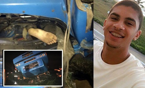 Claudio Henrique Barbosa viajava acompanhado de um amigo quando o caminhão capotou. Excesso de velocidade pode ter causado o acidente, segundo a PRF (Fotos: Reprodução) O jovem Claudio Henrique de Mattos Barboza, de 17 anos, morador de Nova Venécia, morreu após capotar o caminhão que dirigia e que estava carregado de mamão. O acidente aconteceu na noite deste sábado (8), por volta de 22h30, em uma rodovia de Teixeira de Freitas, no Sul da Bahia. De acordo com informações de familiares, esta era a primeira viagem de Claudio com o caminhão que ele ganhou do pai recentemente. O jovem saiu de Nova Venécia com o amigo Alexandre Augusto Silva Morais, 22, que também é caminhoneiro, com destino a Feira de Santana (BA). O amigo foi de carona para ensinar o caminho a Claudio. Um outro amigo deles, também caminhoneiro, seguia atrás em outro caminhão. De acordo com o site Teixeira News, Alexandre será ouvido pela Polícia Rodoviária Federal e deverá responder por crime previsto no Artigo 310, do Código Brasileiro de Trânsito (CBT), que é entregar a direção de um veículo a um menor de idade ou pessoa sem habilitação.