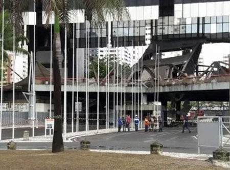Equipes do Corpo de bombeiros, Defesa Cívil, Policia Militar e representantes de órgãos do estado acompanharam na manhã deste sábado (24) uma vistoria no Centro de Convenções de Salvador, no bairro do Stiep, para coletar maiores detalhes do desmoronamento (entenda) de parte da fachada do prédio na noite da última sexta-feira (23). A realização da avaliação já havia sido adiantada pelo secretário de Turismo, José Alves. Um cordão de isolamento foi instalado nos arredores do local do desabamento para evitar que imprensa e curiosos se aproximem do local, que vinha passando por obras emergenciais e estava desativado (saiba detalhes). O episódio deixou duas pessoas feridas.