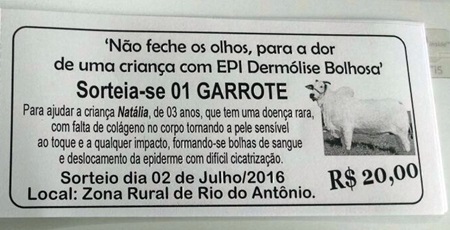 A Epidermólise bolhosa (EB) é uma doença do tecido conjuntivo, que causa bolhas na pele e membranas mucosas. Resulta de um defeito na fixação da epiderme na derme, o que provoca fricção e fragilidade da pele. Sua severidade varia desde casos leves até fatais. Crianças afetadas pela EB costumam ser chamadas de "crianças-borboleta", porque se diz que sua pele é tão frágil quanto as asas de uma borboleta. Após essa exposição, fica claro a gravidade desta doença que ainda não teve a cura encontrada pela Ciência. No município de Rio do Antônio, localizado na região sudoeste da Bahia, existe um caso dessa doença rara, o qual foi desboberto pela equipe do 97NEWS e vem ganhando grande repercussão, ainda mais que a vítima é uma menina dócil, meiga e linda, a pequena Natália, de apenas 3 anos de idade, a qual vem lutando contra esta terrível doença. Ela que mora na zona rural junto com os seus pais, numa residência de condições precárias, o que acaba agravando o seu quadro de saúde, já que não existe banheiro e nem estrutura adequada, o que tem feito as feridas na pele se intensificarem, inclusive indo para regiões muito sensíveis como a língua, a qual está sendo atingida de forma severa, inclusive criando “bolsas” de pus. Outra agravante é que ela tem forte intolerância à lactose, precisando comprar um suplemento que é caro, já que vem apresentando também princípios de raquitismo, o que vem fazer com que a situação de Natália seja de comover os corações mais embrutecidos, então, buscando amenizar a sua dor e angariar fundos para o tratamento mais eficaz, familiares e amigos estão realizando o sorteio de um garrote que será realizado no dia 02 de julho (foto abaixo). Então, ajude a pequena Natália comprando o seu bilhete por apenas R$ 20,00 ligando para (77) 9.8815-2565. Para quem quiser fazer a doação por meio de depósito bancário: Agência 3092-9 - Banco Bradesco- Conta Poupança 1002452-8, em nome de Natália Calixto Alves. O Grupo Alternativa de Comunicação, por meio da 97FM e do 97NEWS irá intensificar a campanha de doações acreditando na solidariedade de seus ouvintes e leitores.