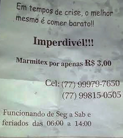 Uma postagem que, à primeira vista, foi vista como brincadeira, acabou se comprovando real e mostrando que existe sempre a possibilidade de se driblar a crise com criatividade e muita dedicação. O anúncio que tinha um apelo muito criativo se intitulava “Em tempos de crise o melhor mesmo é comer barato!!!”, o que atraiu, rapidamente muitos curiosos, que foram comprovar se era mesmo possível se vender um marmitex a apenas R$ 3,00. Inúmeros leitores do 97NEWS, postaram via whatsapp que era possível sim, já que todos disseram terem experimentado a marmitex e aprovado. “A comida é gostosa sim e com mais R$2 eu ainda tomei um refrigerante. Virei freguês”, expressou o mototaxista Mateus Neves de Souza. A operadora de caixa Valdicléia Ribeiro garantiu que “achei que era brincadeira, mas fui lá para conferir e também virei freguesa. A comida é saborosa e de boa qualidade”. Por fim o vendedor Josias Rodrigues declarou que “está aí uma prova que, mesmo em tempos de crise dá para se comer do bom e barato. Realmente existem alguns que exploram demais os clientes, espero que com isso aconteça uma baixa dos preços neste segmento de primeira necessidade”.
