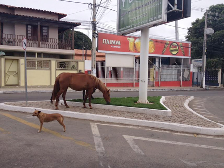 O cavalo pasta e o cão faz a guarda. Cena registrada pela equipe do 97NEWS na manhã desta terça-feira (Foto: Micon Shyneider) A situação dos animais errantes “desfilando” ´pelas ruas de Brumado é uma situação que já virou rotina, pois há mais de dez anos isso acontece sem que, até o momento, fosse encontrada uma solução por parte do poder público. Além do risco aos motoristas e motociclistas, a situação causa um mau aspecto à cidade, que para muitos já virou um “fazendão”, já que em todo lugar esse fato acontece. Um dos ambientes preferidos dos animais é o cartão postal da cidade, a Praça Coronel Zeca Leite, que na manhã desta terça-feira, dia 18, registrou mais uma cena dessas, desta feita com um componente inusitado, já que enquanto o cavalo pastava tranquilamente no jardinzinho de uma placa publicitária, o cão fazia a guarda. Vale ressaltar que os dois são habitués do local. E agora fica o questionamento no ar: até quando isso irá continuar? é o que pergunta a população.