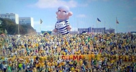 (Foto: Repodução) Um grande número de manifestantes se aglomerou na Esplanada dos Ministérios e se juntou em frente ao Congresso Nacional protestando contra a presidente Dilma Rousseff (PT) neste domingo (16), em Brasília. Além dos carros de som e dos cartazes pedindo a saída da presidente do governo, um grupo levou um boneco gigante do ex-presidente Luís Inácio Lula da Silva para a frente da sede do Legislativo nacional. O boneco simbolizava um pedido de prisão do petista. De acordo com a estimativa da polícia local, cerca de 40 mil pessoas se dirigiram ao Congresso para protestar.