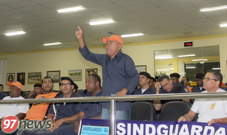 O presidente do SindGuardas, Pedro Santos, muito exaltado garantiu que a sede da prefeitura municipal irá ser invadida caso não haja solução para a crise (Foto: 97NEWS) O impasse estabelecido pelo SindGuardas, que representa os membros da Guarda Municipal de Brumado, já está ganhando contornos de conflito, já que o presidente do referido sindicato, Pedro de Oliveira Santos, que esteve presente junto com a categoria à sessão da Câmara de Vereadores de Brumado desta segunda-feira, dia 17, em alto e bom som, disparou que “nós vamos invadir a prefeitura, nós vamos invadir a prefeitura”. Estas palavras de ordem, que contém um tom mais severo e que realmente comprova a impaciência da categoria com a Prefeitura Municipal, que segundo o próprio sindicato, está se negando a um diálogo. Em entrevista à mídia local, o presidente garantiu que “nós somos legalmente reconhecidos pelo Ministério do Trabalho, temos documentação que comprava isso, então como que a Prefeitura pode alegar que não representamos a categoria. Isso não passa de uma desculpa esfarrapada de quem não quer negociar”. O clima ficou tenso e o presidente da Casa, vereador Alessandro Lôbo teve que intervir pedindo para os guardas e o sindicato para se controlarem, sob pena de ter que encerrar a sessão.