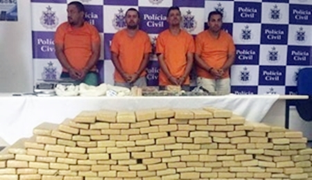 (Foto: Divulgação PC) A Polícia Civil prendeu quatro suspeitos de tráfico de drogas e apreendeu mais de 300 kg de drogas e R$ 74 mil em espécie no sábado, 8, no município de Feira de Santana (a 109 Km de Salvador). A informação foi divulgada pela polícia em coletiva nesta segunda-feira, 10. Conforme a Polícia Civil, foram apreendidos 303 Kg de maconha, mais porções de crack e cocaína equivalentes a 5 Kg, uma pistola calibre 38, uma balança de precisão e material utlizado para o refino das drogas, quando eram transportados dentro do freezer de um caminhão que vinha da cidade Goiânia, estado de Goiás. A delegada Klaudine Passos, titular da DTE de Feira de Santana, informou através de nota da polícia, que a quadrilha já vinha sendo investigada há um mês, após denúncias informando que uma casa na localidade de Sítio Matias, em Feira, funcionava como ponto de venda de drogas. A quadrilha também atuava nos bairros de Cidade Nova, Papagaio e Fraga Maia, onde neste último, a polícia estourou um laboratório de refino de drogas. Ainda conforme a polícia, um dos suspeitos Diego Gomes Viana, 27, motorista do caminhão, informou à delegada que a droga era fornecida por um homem de pré-nome Laércio.
