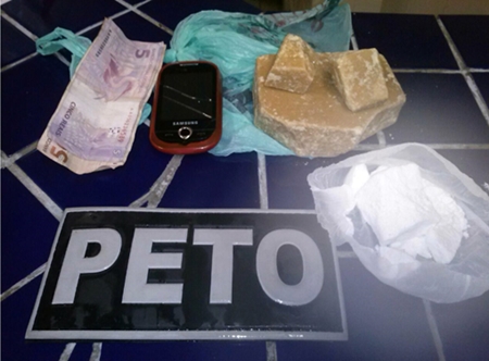 As drogas apreendidas durante a ação da guarnição da Peto (Foto: Polícia Civil) Brumado continua sendo um polo distribuidor de drogas para a região, o que faz com que a Polícia tenha que muito trabalho para prender os vários tentáculos do tráfico que se espalham cada vez mais. No final da tarde desta sexta-feira, dia 06, essa escrita foi comprovada mais uma vez em uma operação de rotina na cidade, na qual, após uma atitude suspeita, um casal que estava em uma motocicleta acabou sendo parado por uma guarnição do Peto. Durante a revista foi encontrado na mochila da adolescente, cerca de 500 gramas de crack e um pacote, com 100 gramas de cocaína. O valor da “mercadoria” giraria em torno dos R$ 10 mil. A jovem assumiu que era a proprietária da droga e relatou que o homem que estava com ela era apenas um mototaxista, que tinha sido chamado por meio da locadora para fazer a corrida até o Terminal Rodoviário de Brumado, onde a adolescente iria embarcar rumo, provavelmente, para alguma cidade da região. Também foi apreendida uma pequena quantidade em dinheiro e um celular.