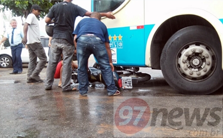 A motocicleta acabou indo parar debaixo do ônibus (Foto: Marcos Paulo / 97NEWS) Um motociclista quase viu a morte no início da tarde desta sexta-feira, dia 06, no cruzamento das ruas Antônio Pinheiro Canguçu e Nina Rodrigues, bem no centro da cidade de Brumado. Segundo informações colhidas pelo repórter Marcos Paulo, junto ao motorista da empresa de viação, o motociclista tentou fazer uma ultrapassagem arriscada e acabou indo parar embaixo do ônibus. Ainda segundo ele o motociclista pode comemorar ter nascido de novo, já que o ônibus, que tinha destino de Seabra, estava em marcha lenta, ou seja, em velocidade muito reduzida.