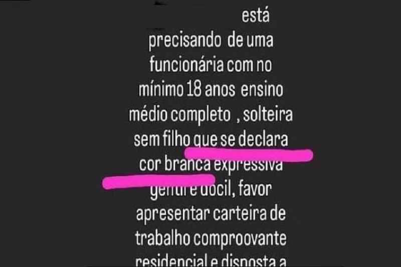 O empresário Edis da Silva Ribeiro gravou um vídeo no qual se pronunciou sobre a polêmica oferta de emprego considerada racista, na cidade de Caetité, Sudoeste da Bahia. Ele, que é dono do estabelecimento, aparece chorando, pede perdão e afirma que se tratou de um erro de digitação no celular. A descrição da loja exigia que a candidata fosse “mulher, solteira, sem filhos, expressiva, gentil, dócil e branca, além de ter mínimo de 18 anos e ensino médio completo”. Emocionado ele narrou: “Estou fazendo esse vídeo para comunicar a todos vocês, para vocês me entenderem, pelo amor de Deus, que quando eu fui postar a mensagem, na edição do texto eu não observei e acabei enviando rápido e postando. Eu não editei o texto, não voltei corrigindo. Do jeito que o próprio sistema do celular me deu, eu fui colocando, eu não corrigi e, com isso, aconteceu o que aconteceu”, disse Edis que ainda compeltou. “Para mim foi uma surpresa. Eu gostaria muitíssimo que vocês me perdoassem. Perdão de coração que eu não sou assim, eu tenho meus parentes, minha irmã, minha esposa, meus filhos que são negros e eu tenho muito orgulho disso. E peço desculpa para todos vocês. Quero me retratar e pedir pedra a todos”, finaliza. Por causa do fato, o Conselho Municipal da Promoção da Igualdade Racial emitiu uma nota de repúdio, na qual identificou o fato como um caso de racismo, misoginia e machismo. Dentro do conteúdo, o órgão enalteceu que repudia todo e qualquer ato ou ação de intolerância, preconceito, discriminação e que atentem contra a honra e dignidade da pessoa humana.