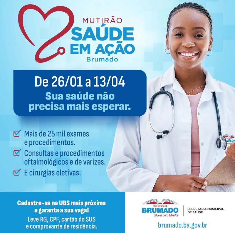 Entre os dias 26 de janeiro e 13 de abril, o município de Brumado, através da Secretaria Municipal de Saúde, vai ofertar a toda a população cerca de 26 mil procedimentos entre consultas, tratamentos, exames e cirurgias, nas áreas de oftalmologia, angiologia e cirurgias eletivas. O "Mutirão Saúde em Ação" terá todos os atendimentos 100% gratuitos. Para participar é preciso fazer o cadastro em alguma das Unidades Básicas de Saúde do município, a partir desta terça-feira (09). Ao marcar o procedimento desejado o paciente precisa apresentar CPF, RG, Cartão do SUS e comprovante de residência. Os atendimentos oferecidos e o cronograma de datas são: Angiologia - Consultas com angiologista, USG com Doppler e Tratamento esclerosante de varizes. Nos dias: 26/01 a 28/01, 28 e 29/02, 12 e 13/03, 25 e 26/03, serão ofertados consultas para Oftalmologia - Cirurgias de Catarata e Pterígio (carne no olho), para pacientes acima de 55 anos ou com diagnóstico prévio. Já as consultas oftalmo serão nos dias: 21/02 a 25/02 / Cirurgias oftalmo - 23/02 a 27/02 / Revisão das cirurgias oftalmo - 24/02 a 28/02. Cirurgias Eletivas - Hernioplastia (inguinal, umbilical e epigástrica), Colecistectomia (pedra na vesícula) e Histerectomia (retirada do útero). Datas: Consultas para cirurgias eletivas - 01/02 a 03/02, 29/02 a 02/03 / Cirurgias eletivas: 29/02 a 28/03, 03/04 a 13/04. Segundo a Secretaria Municipal de Saúde, o objetivo é acabar com as filas de espera nas áreas ofertadas e cuidar diretamente da saúde de milhares de brumadenses, de maneira eficiente e sem burocracia. Os atendimentos do mutirão serão realizados em dois espaços, com consultas e procedimentos mais simples na Policlínica Municipal Manoel Fernandes dos Santos e cirurgias eletivas no Hospital Municipal Prof. Magalhães Neto. Os atendimentos se estendem aos sábados e domingos. Ao total, serão realizados 26.450 procedimentos até o mês de abril.