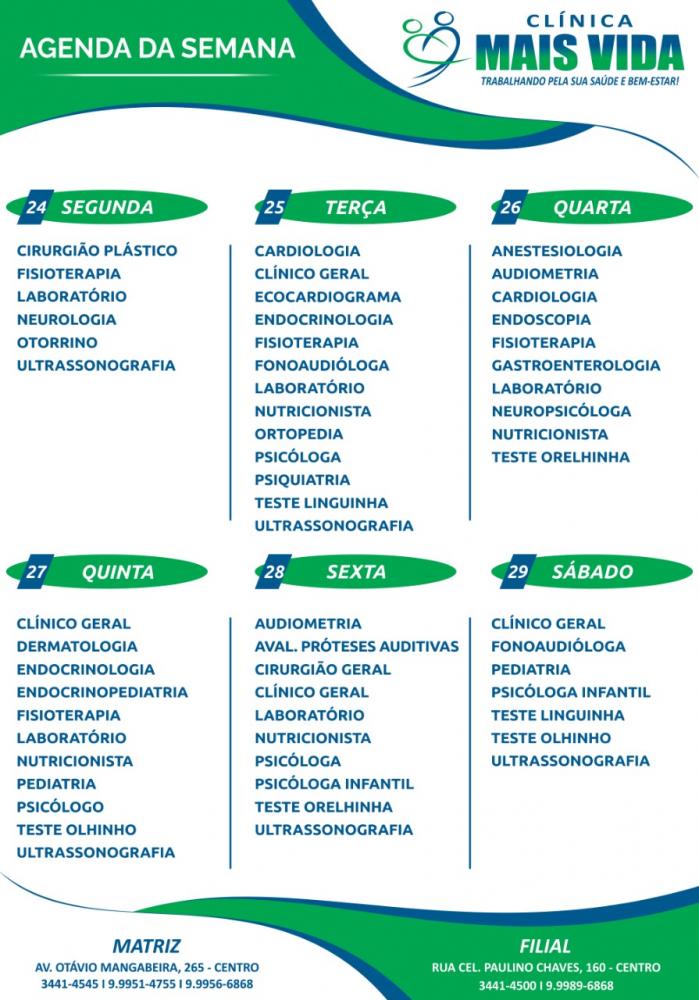 Com o objetivo de facilitar a marcação de consultas, a Clínica Mais Vida criou um quadro com as datas de atendimento dos especialistas e procedimentos. A clínica funciona de segunda a sábado. Confira o quadro acima e marque a sua consulta através dos telefones (77) 3441-4545 / (77) 99951-4755 / (77) 99180-9496 / (77) 3441-4500 / (77) 99989-6868 (77) 99956-6868. A nossa matriz está localizada na Avenida Otávio Mangabeira, 265 (Próximo a Biblioteca) e nossa filial na Rua Coronel Paulino Chaves, 160, Centro.