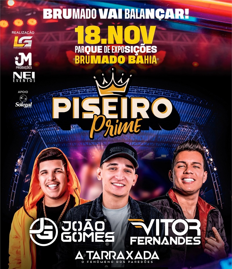 O som do Piseiro, está dominando o país! Entre os ritmos mais tocados nas rádios, redes sociais e plataformas digitais contabilizando milhões de streams e com hits na lista das músicas mais executadas vai ecoar por Brumado. Vem aí o Piseiro Prime um projeto que vem conquistando o país e atraindo multidões por onde passa. O Piseiro Prime acontecerá dia 18 de novembro, no Parque de Exposições Gilson Brito (BA-148 - saída para Livramento) e vai reunir 02 grandes atrações, os maiores nomes do ritmo considerados fenômenos na internet e com grandes destaques na cena musical nacional. João Gomes e Vitor Fernandes e a sensação dos paredões: A Tarraxada. Esse trio da pesada promete levar o público ao delírio com seu som vibrante e sua alegria. Os ingressos para o Piseiro Prime estão disponíveis no site www.ingresso.tech. A realização fica por conta da LG Produções e Eventos; Só Legal Serviços; Janete Meira e Nei Eventos.