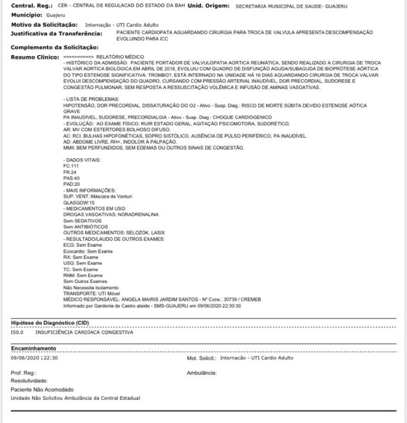 Relatório do paciente - Foto: 97NEWS Conforme a SESAU de Brumado, "o médico plantonista não negou atendimento, muito pelo contrário, ele liberou a sala vermelha do hospital e tudo que era necessário para a mesma atender o paciente", contou. Por fim, a Secretaria de Saúde do município de Brumado afirmou que "a médica não tinha muita experiência com urgência, ficou perdida, e infelizmente o paciente faleceu". Sobre a negligência no atendimento alegado pela médica de Guajeru, a SESAU disse que "a paciente estava sob a responsabilidade de uma médica, e o hospital liberou a sala de emergência pra ela trabalhar". No boletim médico, o relatório aponta que o paciente ficou internado 16 dias em uma unidade de saúde de Guajeru aguardando cirurgia para troca válvula e apresentava "descompensação evoluindo para ICC". O documento ainda mostra que o paciente -- que era cardiopata -- possuía uma lista de problemas, entre eles: Risco de morte súbita devido a estenose aótica grave; PA inaudível; Choque cardiogênico; Sopro sistólico e, entre outros.